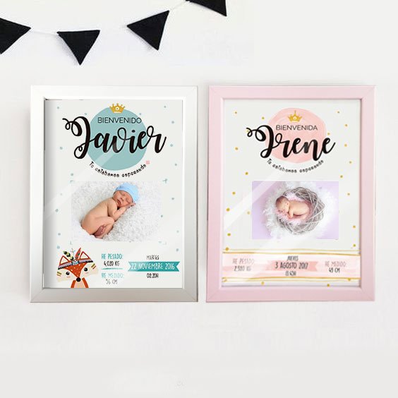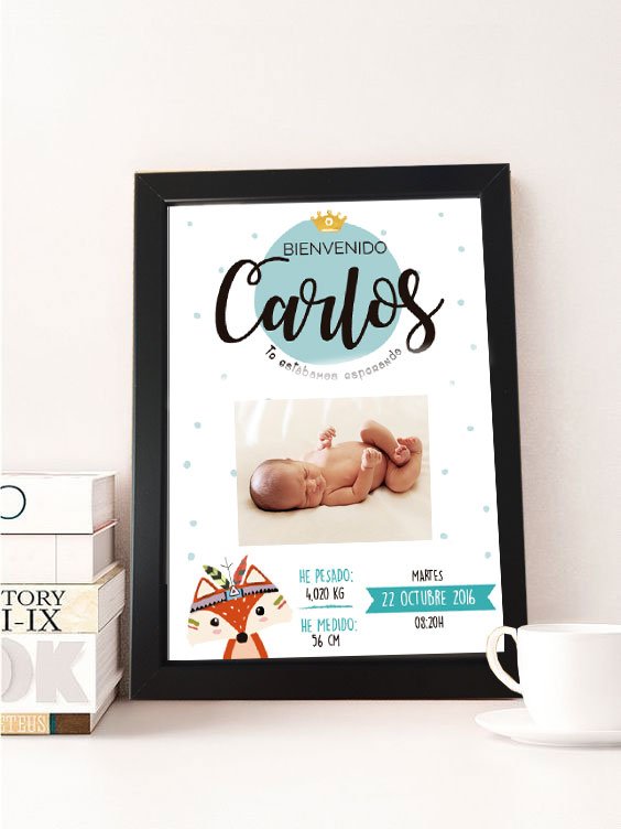 Nos envías la foto y los datos de nacimiento por WhatsApp y te preparamos esta preciosa lámina enmarcada de formato 33cm x 24cm